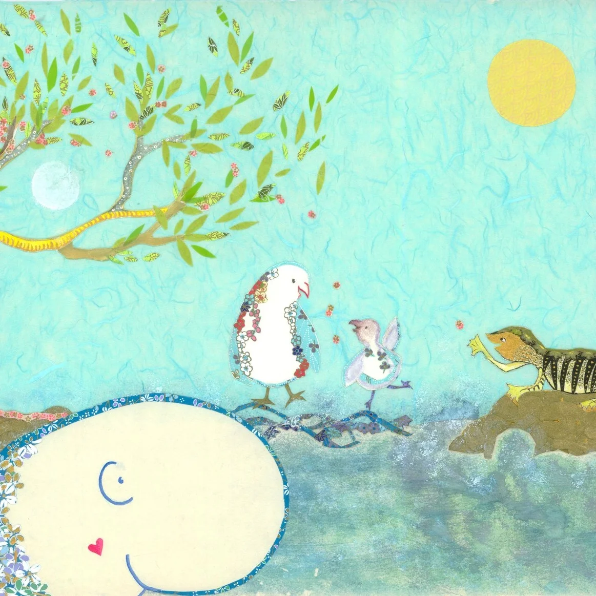 The illustrative style I use came about during the creation of a 20 page wordless love story. I began to cut out hundreds of tiny pieces of paper and create images. Friends and family were represented as trees, birds, fish, dragons and whales. A broken heart became thousands of little flowers and the night sky a full moon on black rice paper.